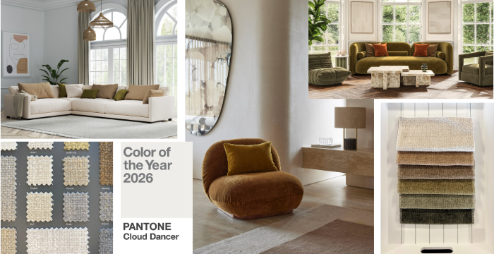 From Comfort to Contrast. For a grounded, restorative feel, surround Cloud Dancer with organic colours and warm tones to mimic Pantones ‘Comfort Zone’ palette — interiors designed for unwinding and quiet connection.